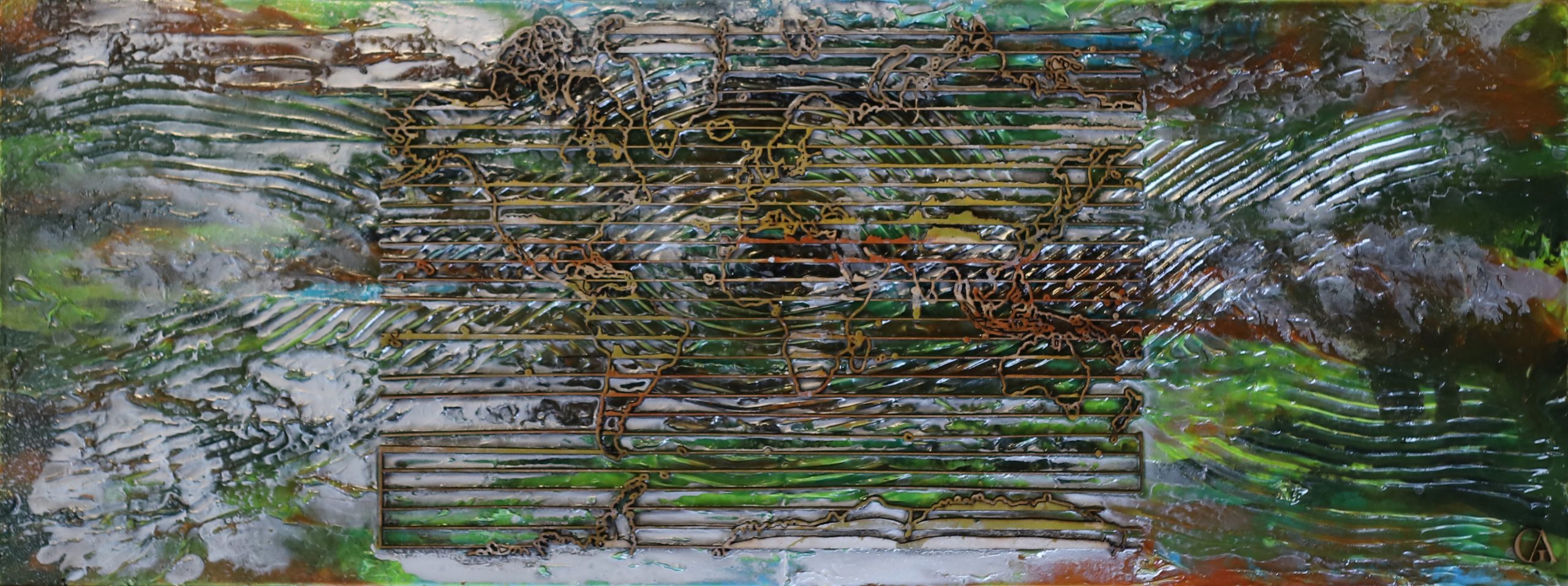 In this reimagined Mercator projection, the world is depicted not as a fixed entity but as a dynamic, shifting terrain, with latitudinal cross sections etched into the surface to reveal underlying rhythms. The foreground features the adaptive cycle, drawn from ecological thought, symbolizing the phases of growth, stability, collapse, and rebirth. This artwork reflects the continuous cycle of life, reminding us that in every moment of decay lies the promise of renewal, and each phase of stability carries the seed for future transformation, urging recognition of resilience and the endless possibilities within life’s cycles.